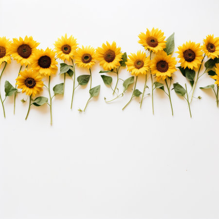 a line of sunflowers arranged against a white background.