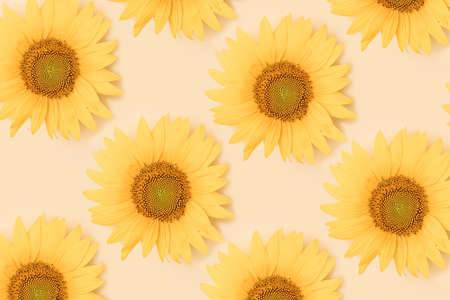A beatiful pattern created of yellow sunflowers on beige background. Top view.