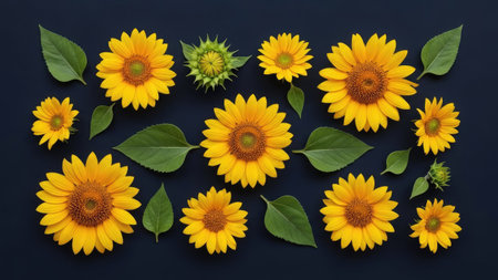 Top view of yellow sunflowers with green leaves on dark blue background