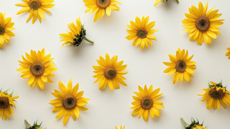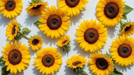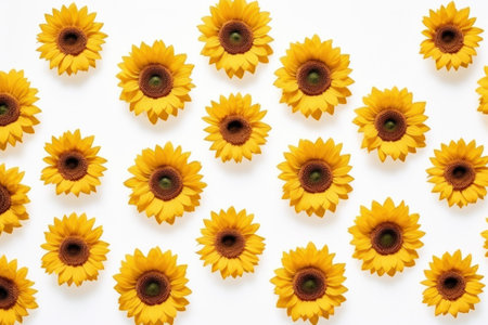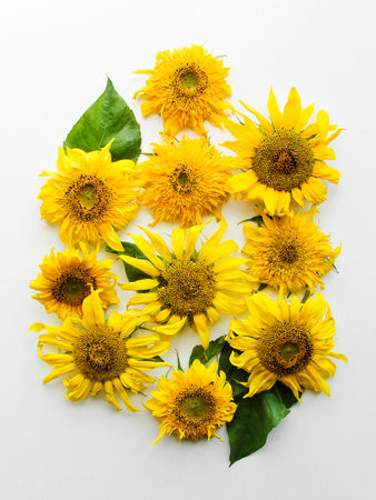 Artistic arrangement of sunflowers on a white background, creating a bright and cheerful composition