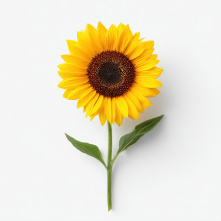 A stunning sunflower accompanied by lush green leaves, showcasing its vibrant yellow petals against a clean white background, perfect for nature-themed projects.
