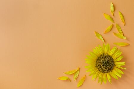 Beautiful sunflower with petals on peach background. Place for text. Flat lay.