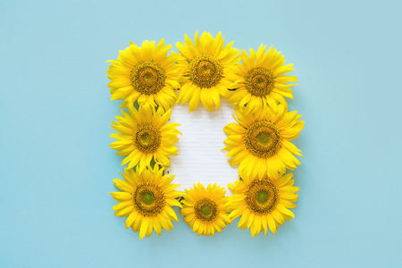 Frame made of blooming sunflowers with green leaves on blue background with copy space