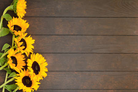 Beautiful yellow sunflowers on wooden background with copy space