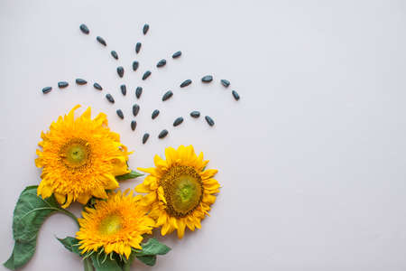 Flat lay of sunflowers and sunflower seeds on a light pink background. The concept of beauty and preservation of youth. High quality photo