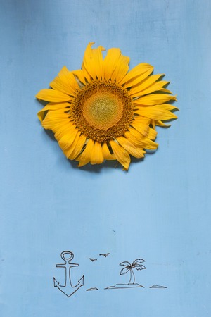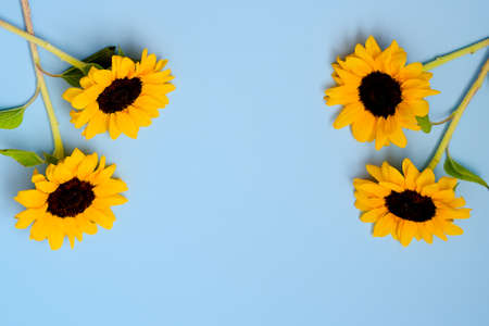 Beautiful sunflowers on a pastel blue background. greeting card template. view from above. copyspace.