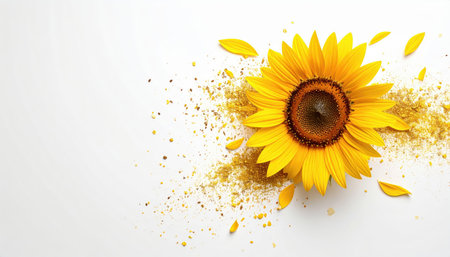 A stunning sunflower blooms with vibrant yellow petals, surrounded by golden dust and scattered petals on a clean white background, perfect for seasonal themes.