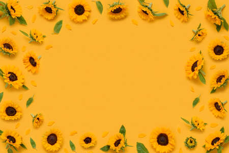 Ornamental sunflower flowers frame border with leaves buds and petals on yellow background top view flat lay