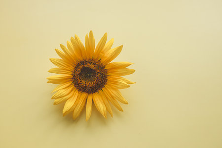 Flat lay of a single sunflower with a clean, neutral background, providing ample space around it for text or logos.