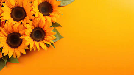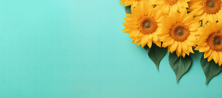 Yellow Sunflower Bouquet on bright Yellow Background, Autumn Concept, Top View, Space for Text, banner size