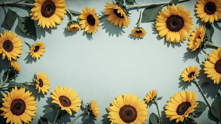 A vibrant arrangement of yellow sunflowers with dark centers and green leaves forms a decorative border on a light blue textured background.