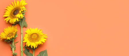 Beautiful sunflowers on color background with space for text