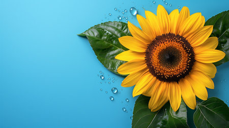 Sunflower flower with raindrops on blue backgrounds in a brilliant studio shot.