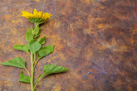 Autumn banner with a yellow sunflower on vintage textured wooden background. Space for text. Top view, flat lay.