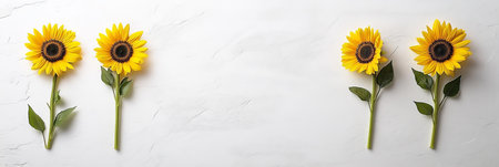 Four Fresh Yellow Sunflowers Arranged In Row On White Textured background With Copy Space