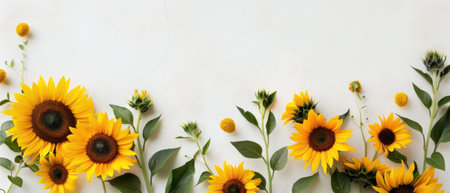 Artistic arrangement of sunflowers on a white background, creating a bright and cheerful composition