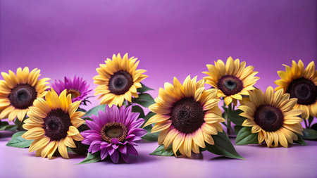 A row of vibrant yellow sunflowers and purple flowers on a bright purple background.