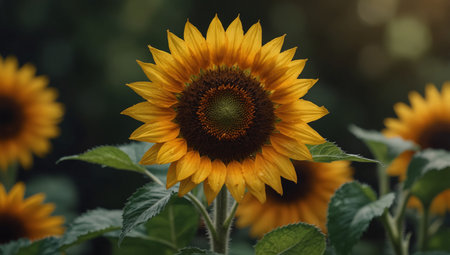 Sunflowers stand tall and bright under the warm glow of the setting sun. Their yellow petals create a stunning contrast against the green foliage, capturing natures beauty.