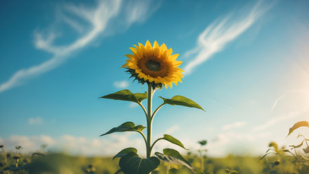 A single sunflower standing tall against a deep blue sky, its bright yellow petals glowing in the sunlight and green leaves adding contrast --chaos 10