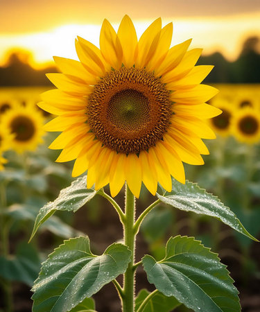 A stunning sunflower field captured during golden hour, showcasing vibrant yellow blooms against a serene sky. Ideal for nature lovers and agricultural themes.