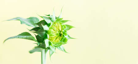 Closeup of beautiful sunflower bud on a yellow background. horizontal banner copy space. new life concept