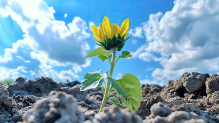 A vibrant sunflower rises from rich soil under a bright blue sky filled with fluffy clouds, symbolizing growth and beauty in nature's landscape.