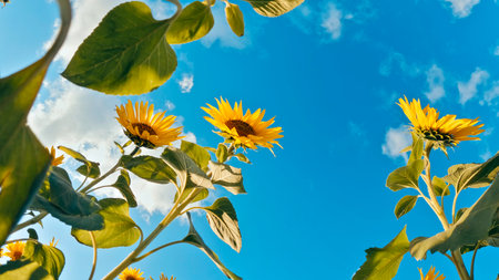 Sunflowers bloom joyfully in sunlight, reaching for the clear blue sky, creating a vibrant and uplifting natural scene outdoors.