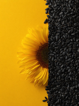 A vibrant sunflower stands proudly next to a pile of dark black seeds against a bright yellow backdrop, showing the contrast of natures colors and textures.