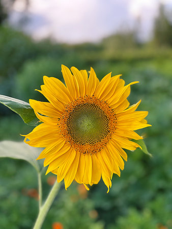 A stunning sunflower stands tall against a soft twilight sky, symbolizing elegance and beauty in nature. The warm hues evoke tranquility and freshness.