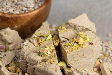halva from roasted sunflower seeds and crushed into one solid mass with pistachios, a sweet delicious dessert made from fried sunflower seeds, side view