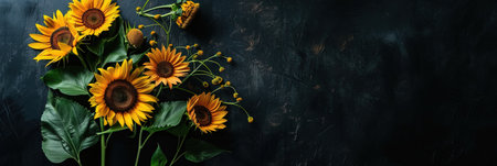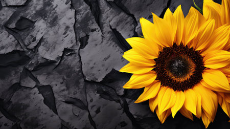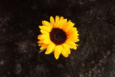 Single bright colorful yellow sunflower centered on a dark textured background with lateral copyspace, view from above
