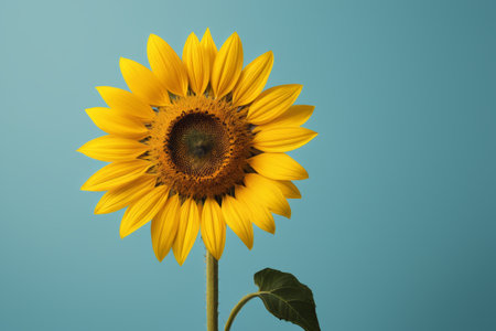 This vibrant sunflower stands tall against a soft blue background, showcasing its cheerful yellow petals and green leaves, perfect for nature-themed projects.