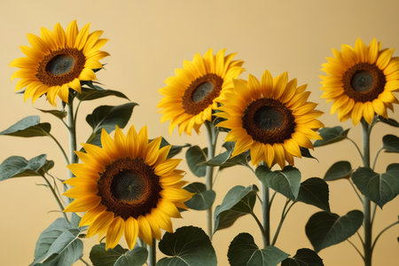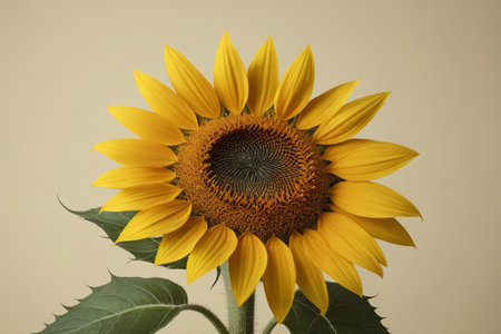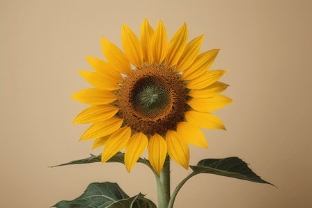 Sunflower on a beige background. Yellow sunflower with green leaves.