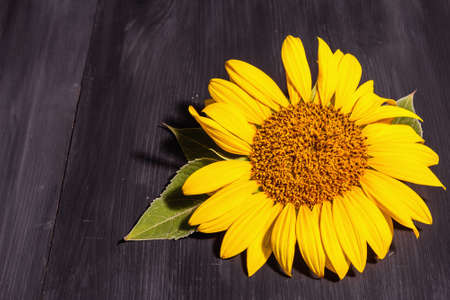 Yellow sunflower on black wooden background. Summer bright greeting card template, place for text