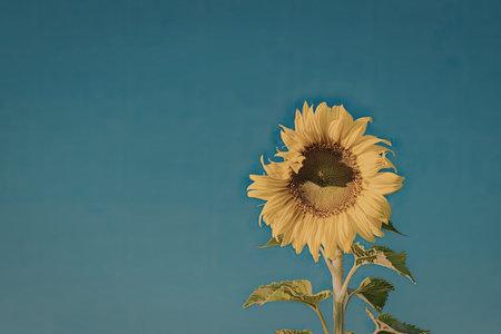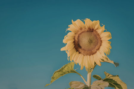 A stunning sunflower stands tall against a clear blue sky, showcasing its vibrant yellow petals. This image captures the beauty of nature in summer, perfect for cheerful themes.