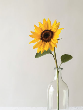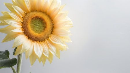 Flat lay of a single sunflower with a clean, neutral background, providing ample space around it for text or logos.