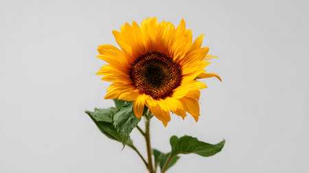 A single bright yellow sunflower with green leaves is placed against a light blue background, showing its vibrant petals and intricate center, creating a cheerful atmosphere.