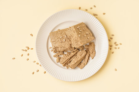halva from sunflower seeds on a white plate. national traditional sweetness of turkish halva on the table