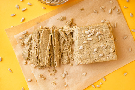 Sheet of baking paper with tasty halva and sunflower seeds on yellow background