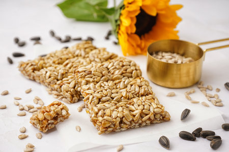 Tasty kozinaki with sunflower and measuring cup of seeds on white background