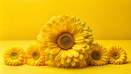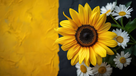 A beautiful composition featuring a bright sunflower surrounded by delicate daisies, set against a textured yellow background, perfect for adding a cheerful touch.