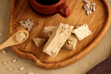 Natural vegan product. Halva sunflower on a wooden board and background with textiles. Eastern sweetness. Rustic style. Close up
