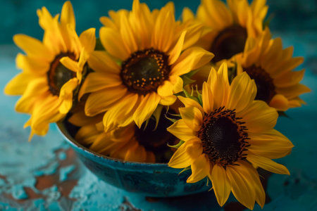 sunflowers in the style of zeiss planar t 80mm f2.8 lens, featuring nature-inspired compositions with water drops, spirals, and vibrant orange and bronze colors. these high-definition wallpapers and desktop backgrounds showcase eye-catching details in matte photos. ai generated