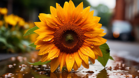 a sunflower is sitting on a puddle with water droplets on it