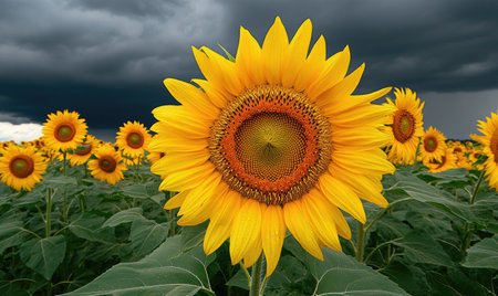 A striking close-up view of a sunflower in full bloom, radiating vibrant yellow petals under a dramatic sky. This image captures the beauty of nature and freshness.