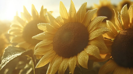 A stunning close-up of vibrant sunflowers adorned with fresh dewdrops, basking in warm sunlight during sunset. This image captures the essence of nature's beauty.