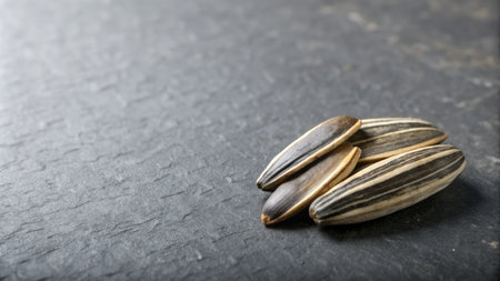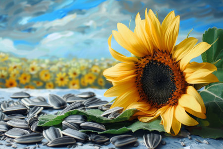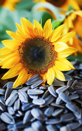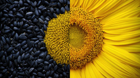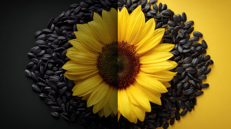 rich dark sunflower seeds are beautifully arranged, accompanied bright yellow petal, symbolizing potential for blooming advertisement captures their appeal and vitality