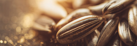 Close-up view of sunflower seeds on a dark background, illuminated by soft, warm light that highlights their unique texture and shape.