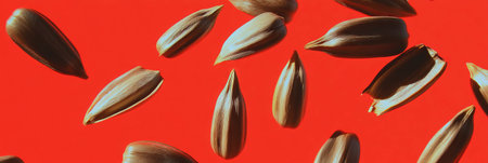 Sunflower seeds scattered on a bright red background showcasing varied textures and sizes