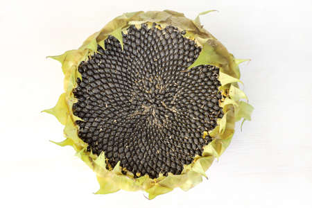 round sunflower with the seeds lying on a light wood surface top view / sun ripened